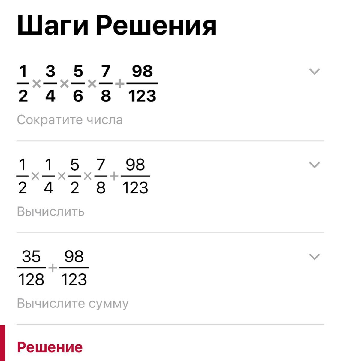 Выполни действия: 1/2 ×3/4×5/6×7/8+98/123