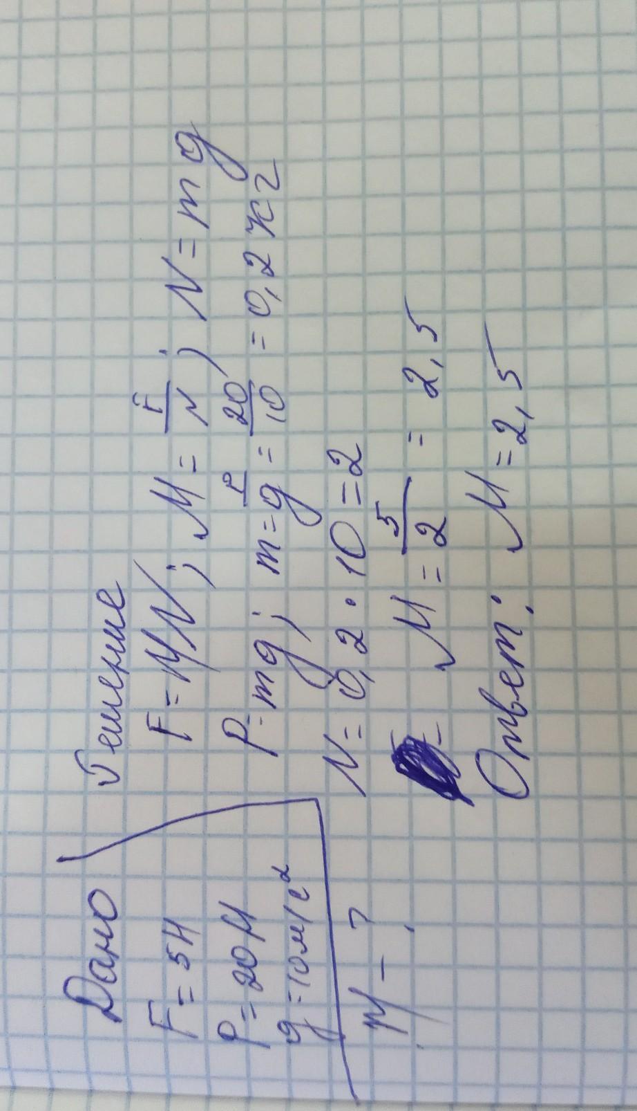 тело скользит по горизонтали плоскости,найти коэффициент трения,если сила трения равна 5 H,а вес тела-20 H