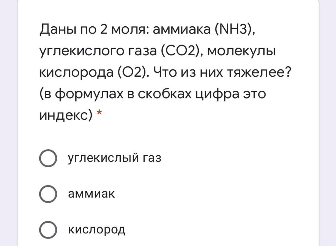 Даны по 2 моля: аммиака (NH3), углекислого газа (СО2), молекулы кислорода (О2). Что из них тяжелее? (в формулах в скобках цифра это индекс)