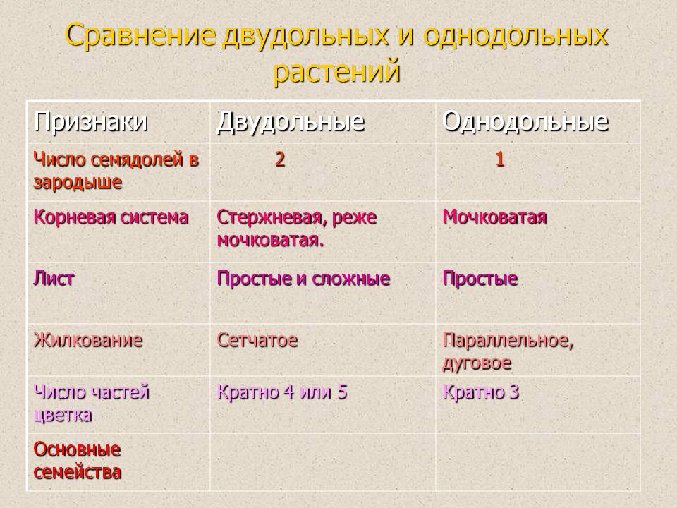 таблица на тему однодольные и двудольные растения