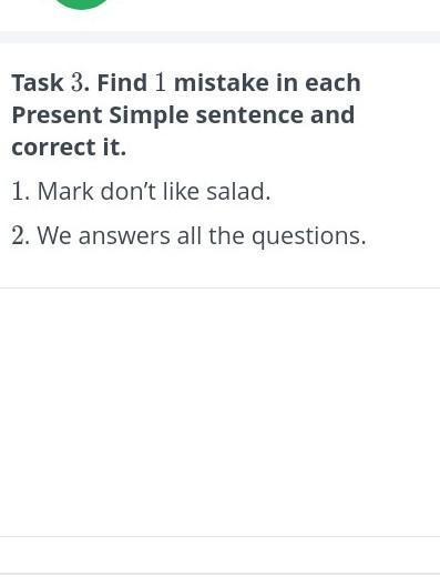 Task 3. Find 1 mistake in each Present Simple sentence and correct it. 1. Mark don't like salad. 2. We answers all the questions.
