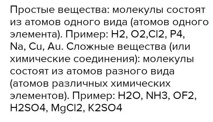 Простые вещества: молекулы состоят из атомов одного вида (атомов одного элемента). Пример: H2, O2,Cl2, P4, Na, Cu, Au. Сложные вещества (или химические соединения): молекулы состоят из атомов разного вида (атомов различных химических элементов). Пример: H2O, NH3, OF2, H2SO4, MgCl2, K2SO4