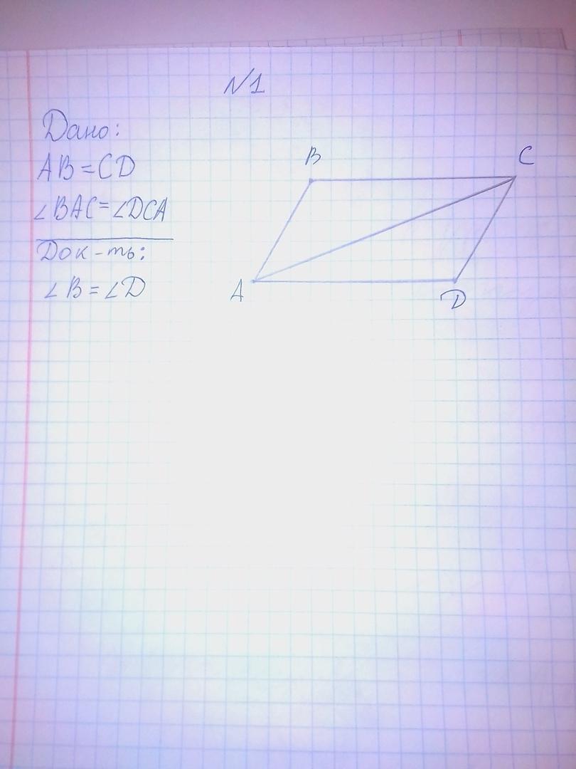 так как углы BAC и DCA равны по условию, то можно доказать что прямые параллельны следуя из DC AD секущая АС накрест лежащие углы. Следуя из того что AB=BC BA=DC можно доказать что фигура параллелограмм (потому что они и равны и параллельны) Следовательно из свойств параллелограмма можно доказать что угол B=D потому что в параллелограмме противоположенные углы (по диагонали) равны. Надеюсь понятно объяснил, но в решении могут присутствовать темы которые вы возможно еще не проходили!