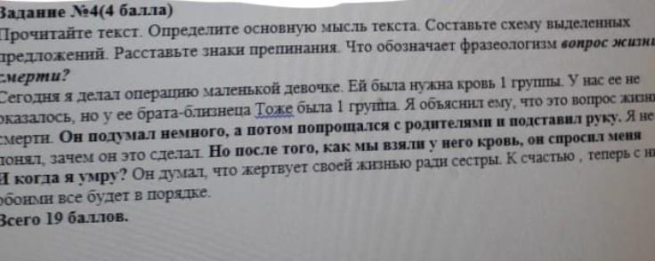 Основная мысль текста-о том что девочке нужна была кровь,а ее брат близнец был с такой же кровью,и он отдал ее своей сестре,думав что вскоре умрёт.