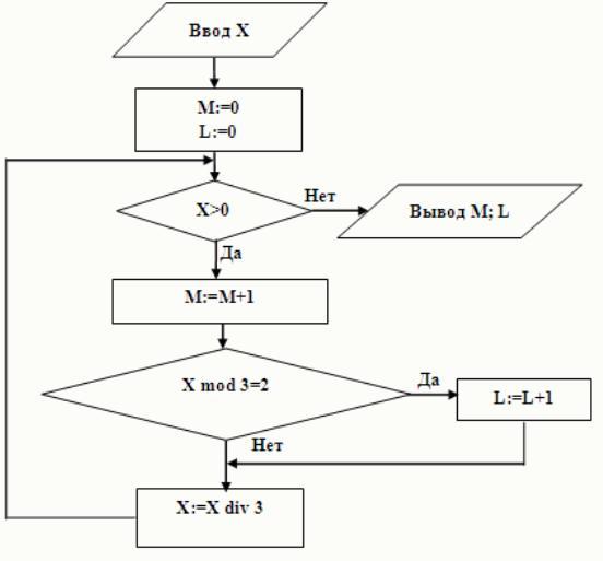 Сначала M = L = 0, затем в цикле, пока X > 0, к M прибавляется 1, к L прибавляется 1, если последняя цифра в троичной записи числа равна 2. Потом последняя троичная цифра отбрасывается. В конце выводится M и L.