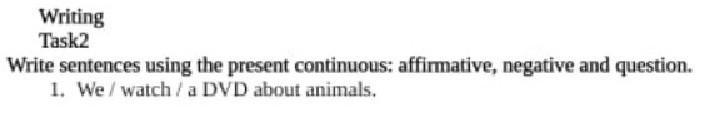 write sentences using the present continuous:affirmative, negative and guestion.1.We/watch/a DVD about animals