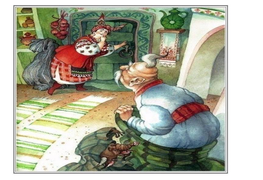 Судя по иллюстрации, речь идёт о повести "Ночь перед Рождеством" Н.В. Гоголя. Думаю, что это комичный эпизод, в котором Солоха поочередно прятала своих визитёров-кавалеров в мешок из-под угля (Голову, дьяка Осипа Никифоровича, Чуба), навещавших поочерёдно Солоху, любящую мужское внимание. Полагаю, что из мешка выглядывает прячушийся от кузнеца Чуб, под которым уже спрятаны Голова и дьяк. А в соседнем мешке спрятался чёрт, навестивший Солоху первым. Позднее всю эту честную компанию в мешках вынесет кузнец.