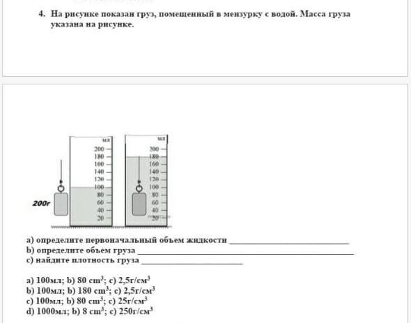 4. На рисунке показая гру, помешенный в мензурку с водой. Масса груза указа на рисуеке