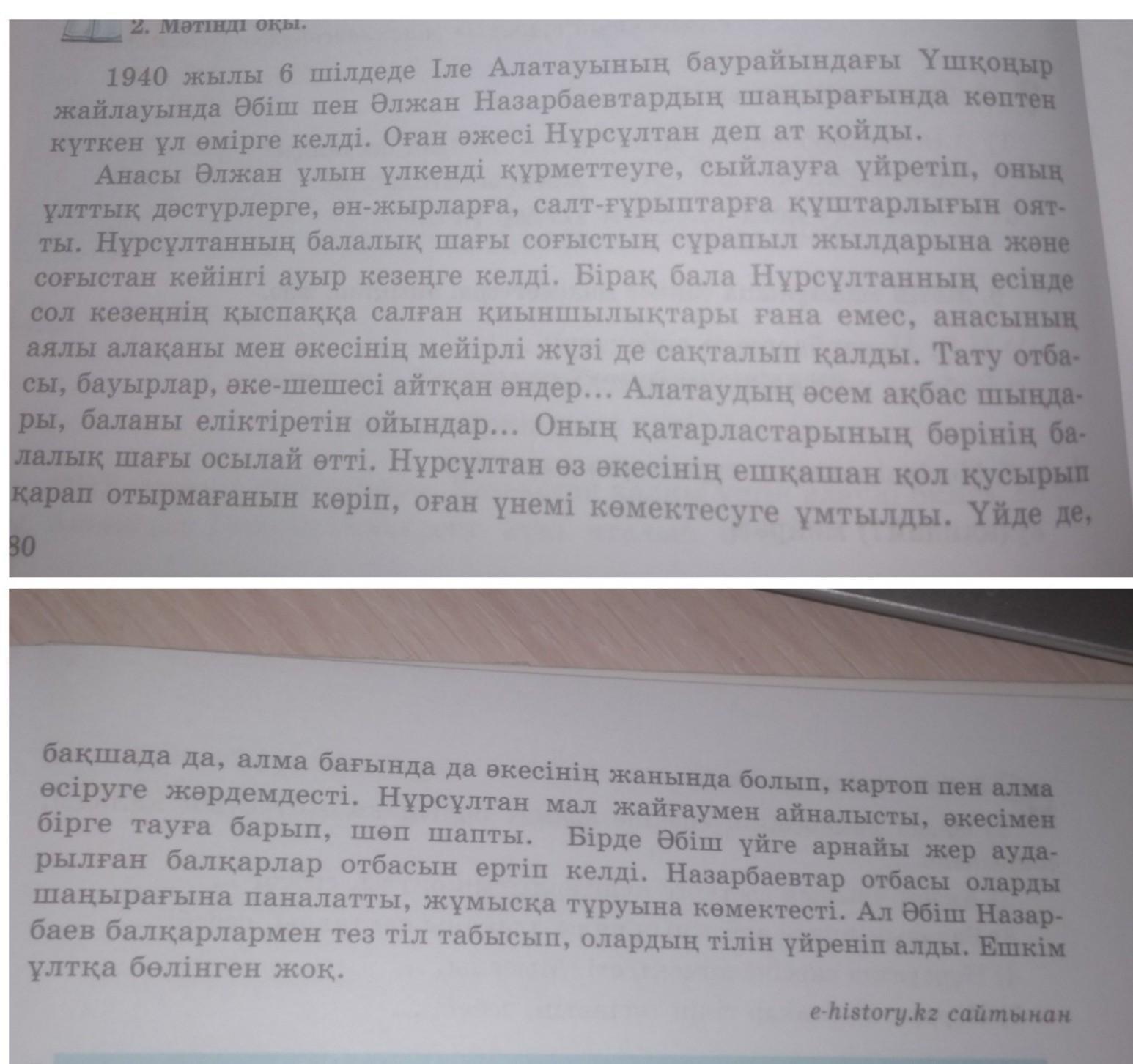 4) Нұрсұлтан әкесіне көмектесті. Мысалы,мал жайғауға,бақшада алма мен картоп өсіруге,шөп шабуға көмек қолын созған.