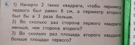 1. Начерти квадрат 4х4 на клетчатой тетради, тогда периметр будет 8 см. Второй квадрат должен быть в 3 раза больше, т.е. его периметр должен быть 24 см. 24/2=12. Значит начерти квадрат 12х12 клеток. Периметр будет 24 см