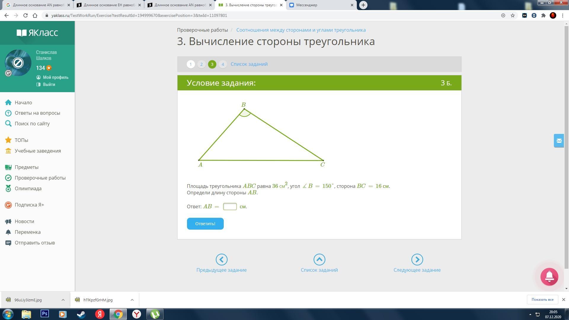 Площадь треугольника ABC равна 36 см2, угол ∡B=150°, сторона BC=16 см.
