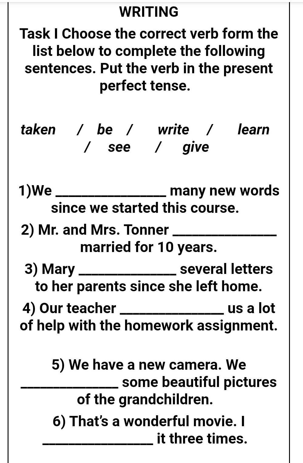 правильный ответ : 1)Have learnt 2)Has been3) Has written 4)Has given 5)Have taken 6) Have seen