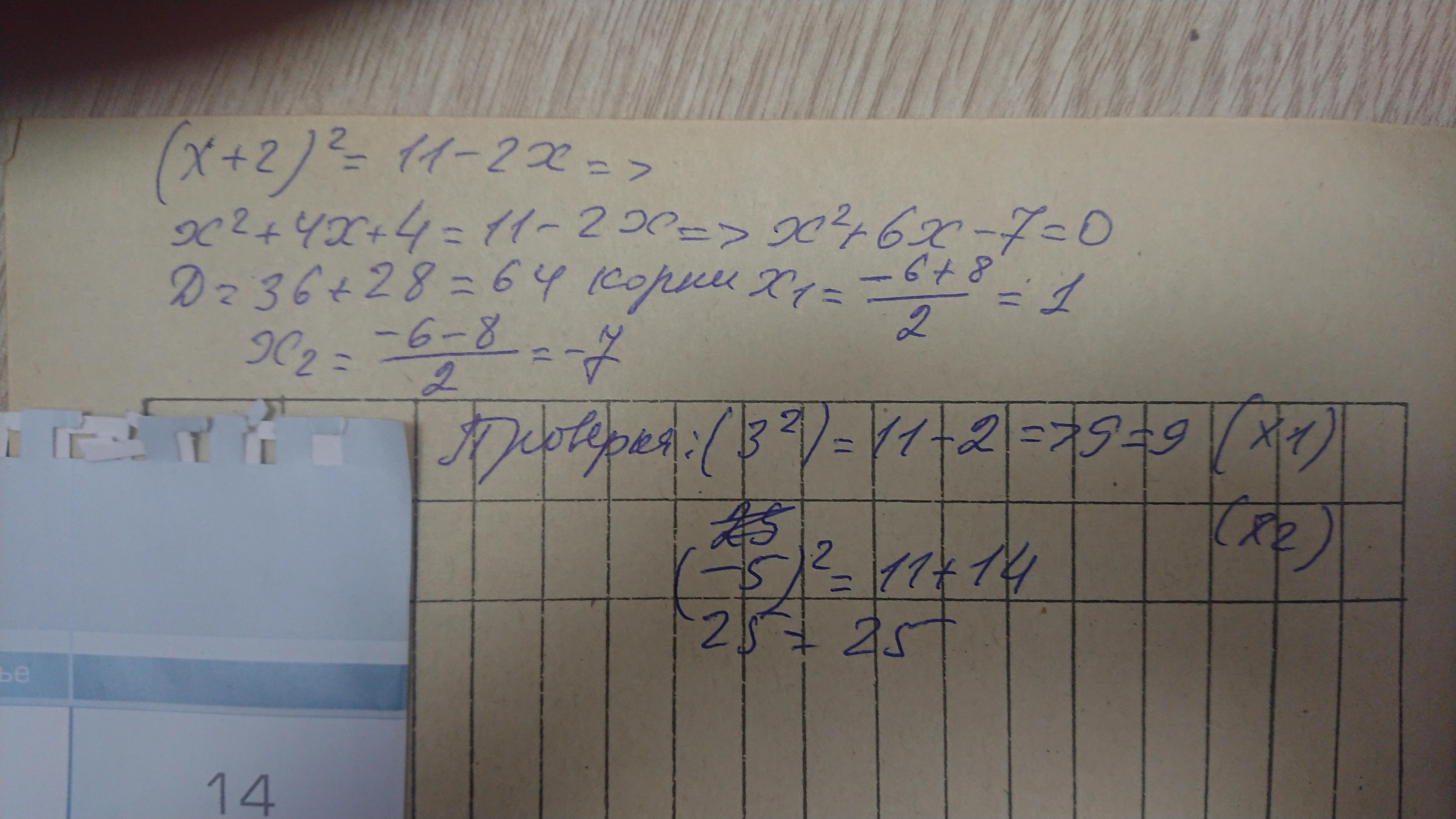 Найди корни уравнения: (х + 2)2 = -2х + 11.