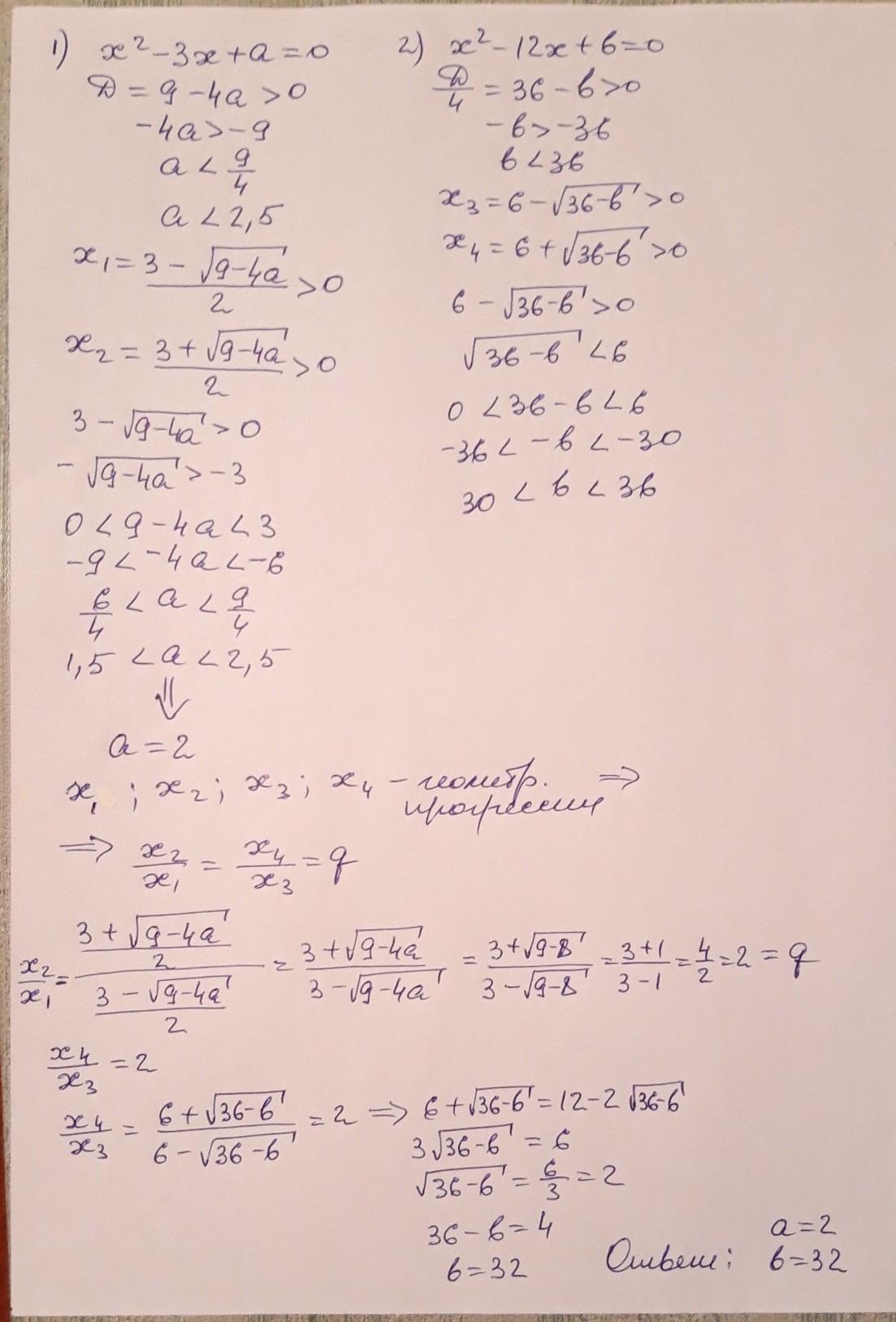 Числа x1 x2 x3 x4 являются последовательными членами геометрической прогрессии с положительными членами так что числа x1 x2 корни уравнения x^2-3*x+a=0 а числа x3 x4корни уравнения x^2-12*x+b=0 укажи значение a b