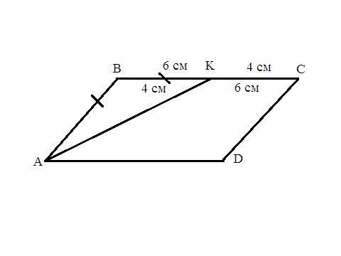 Найдите периметр параллелограмма ABCD,если биссектриса AK,проведённая из вершины острого угла А,точкой К делит сторону ВС на 6 см. и 4 см.Рассмотреть все случаи(их 2)