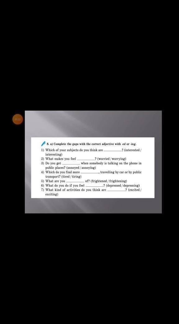 1 interesting 2 worried 3 annoyed 4 tiring 5 frightened 6 depressed 7 exciting