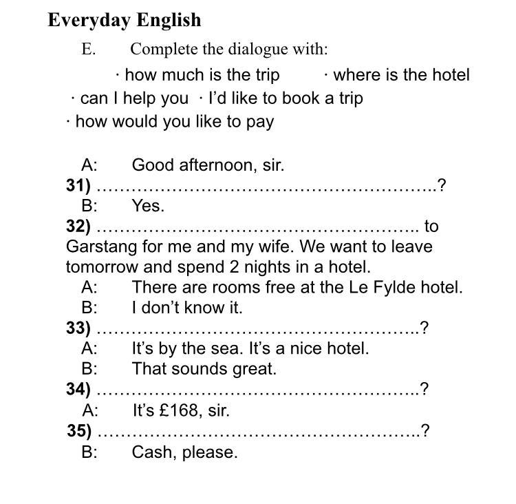 · how much is the trip · where is the hotel · can I help you · I’d like to book a trip