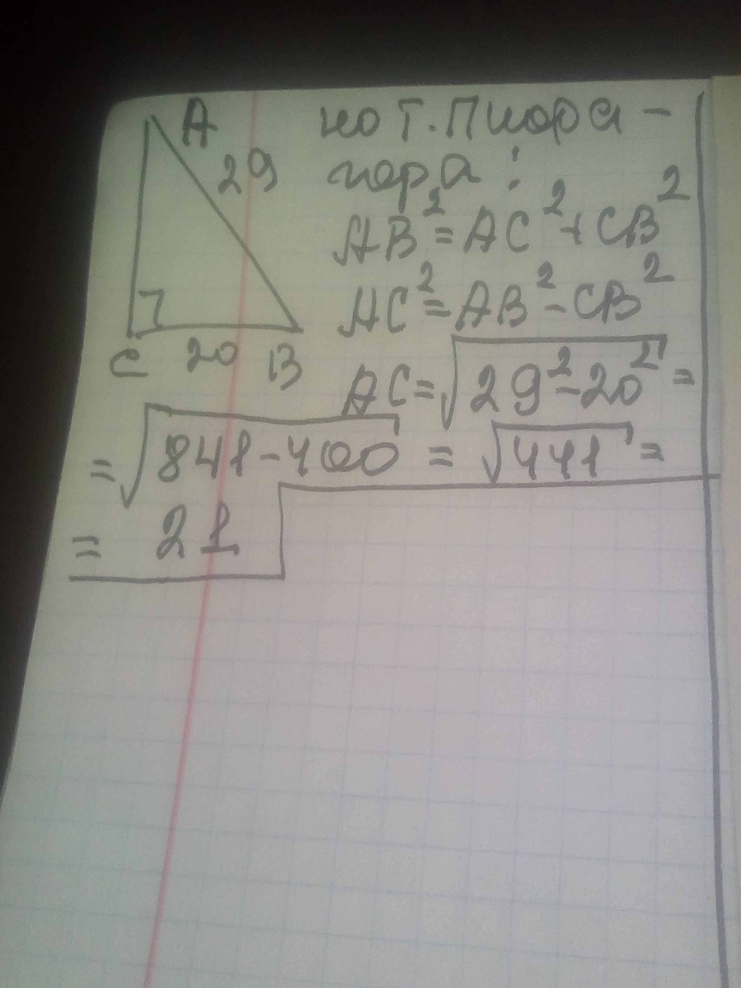 Как найти катет прямоугольного треугольника если его гипотенуза =29,а катет 20