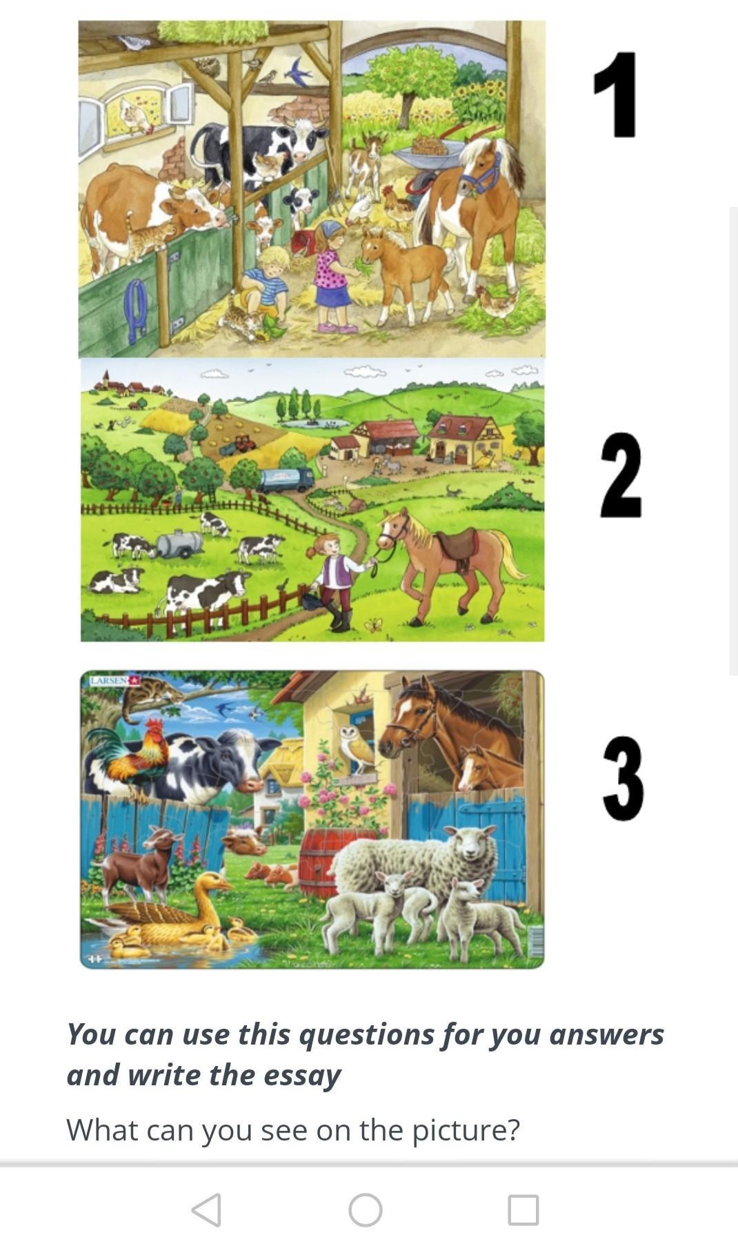 The second picture shows fields and a farmer walking with a horse.