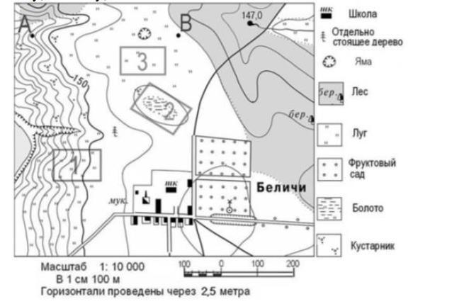 в) в каком направлении необходимо двигаться из точки B чтобы прийти к лесу; к болоту; к школе