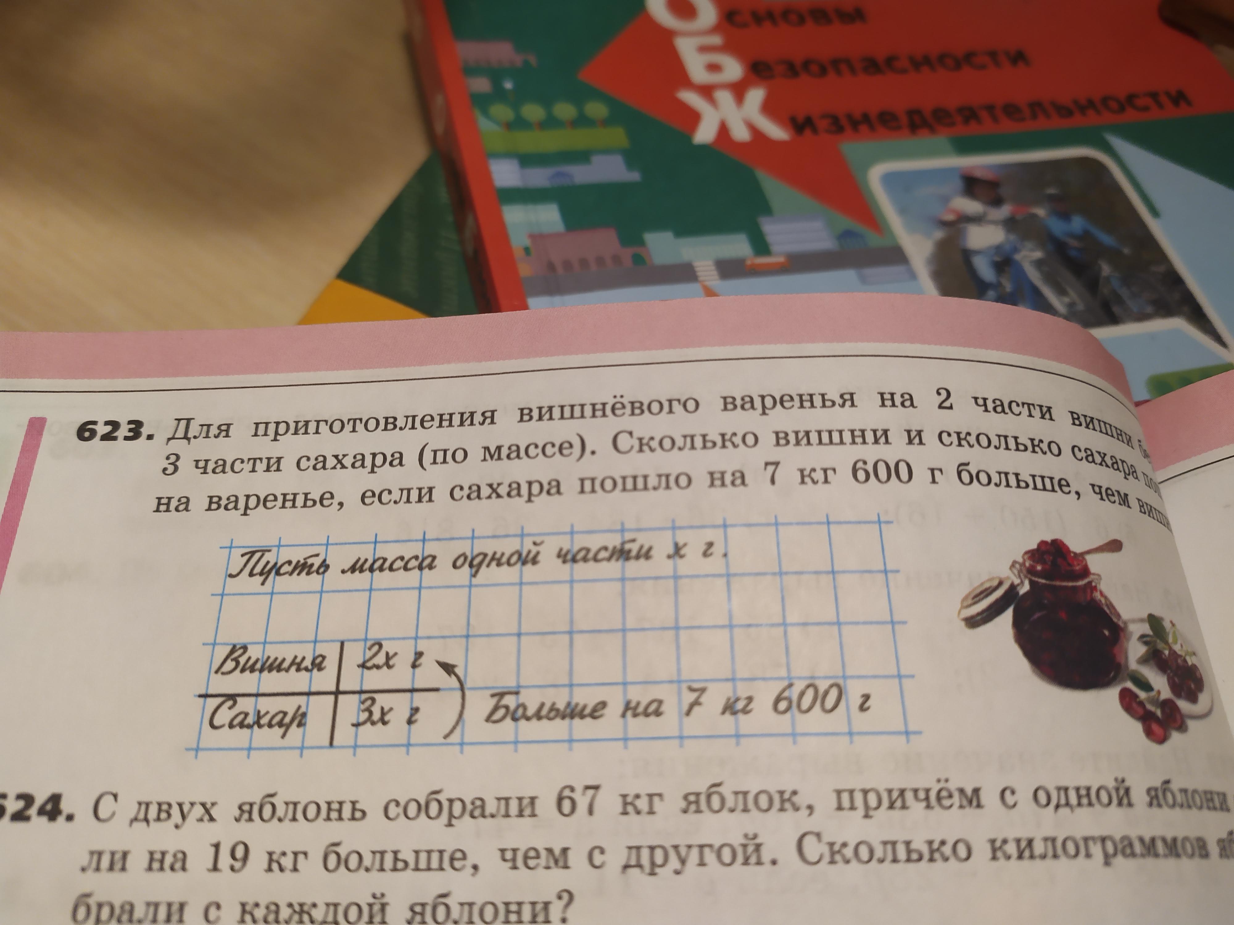 Пусть х - это одна часть, тогда 2х - это две части вишни, а 3х - это три части сахара , так как сахара пошло на 7кг 600г (7600 г) больше, чем вишни то имеем уравнение