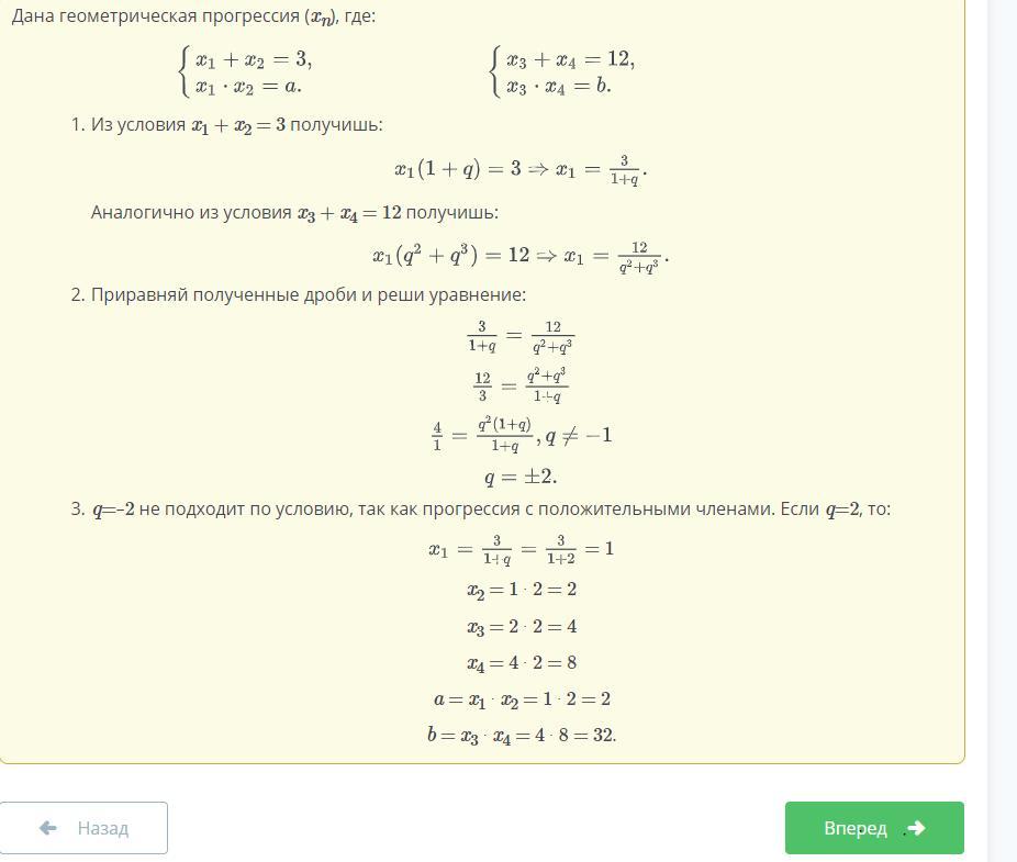 Числа x1 x2 x3 x4 являются последовательными членами геометрической прогрессии с положительными членами так что числа x1 x2 корни уравнения x^2-3*x+a=0 а числа x3 x4корни уравнения x^2-12*x+b=0 укажи значение a b