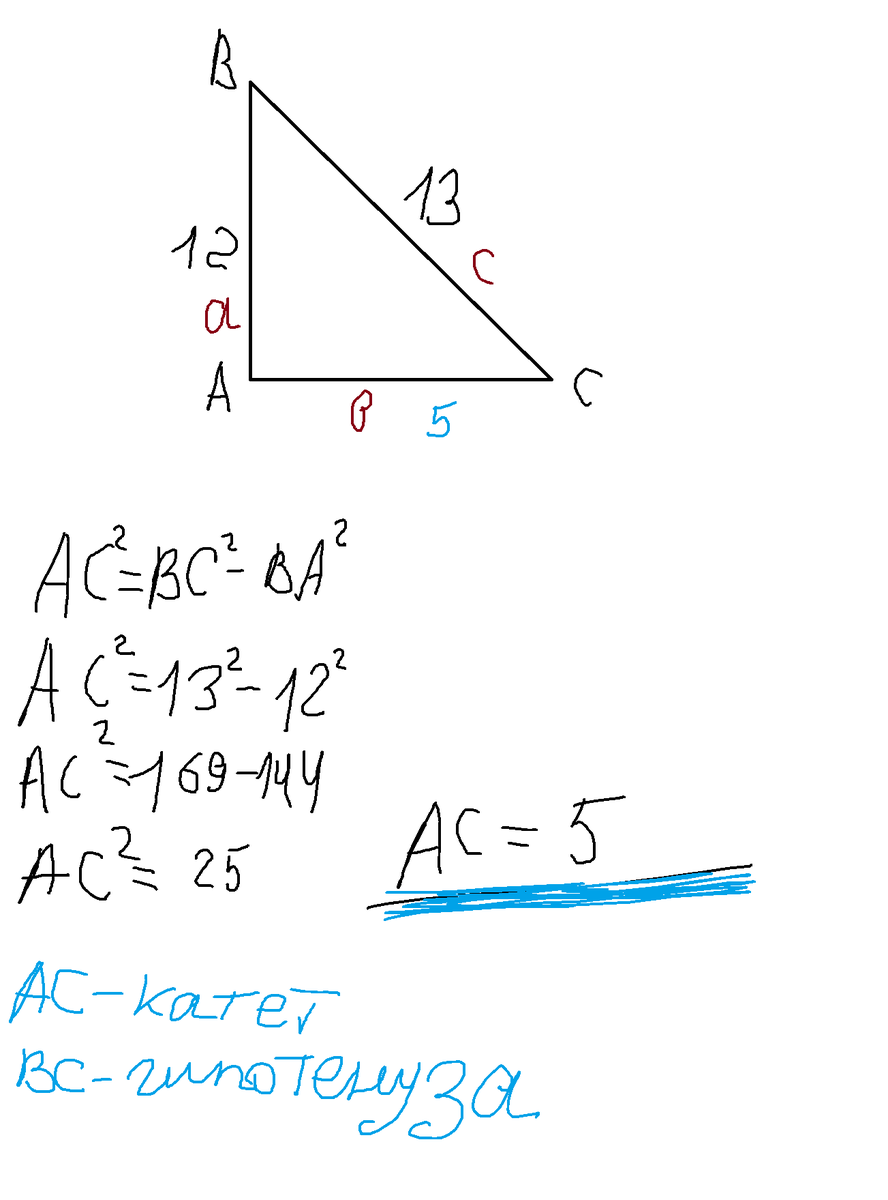 Один из катетов прямоугольного треугольника равен 12 см, а гипотенуза 13 см. Найдите второй катет и гипотенузу треугольника.