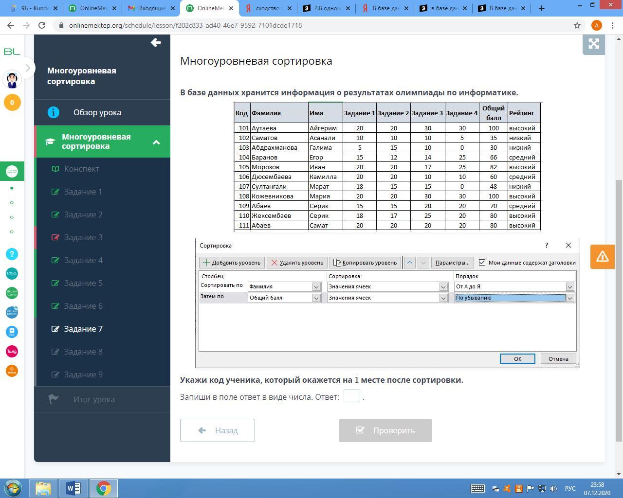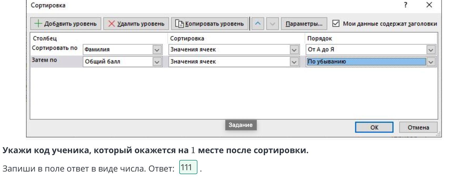 Укажи код ученика, который окажется на 1 месте после сортировки.