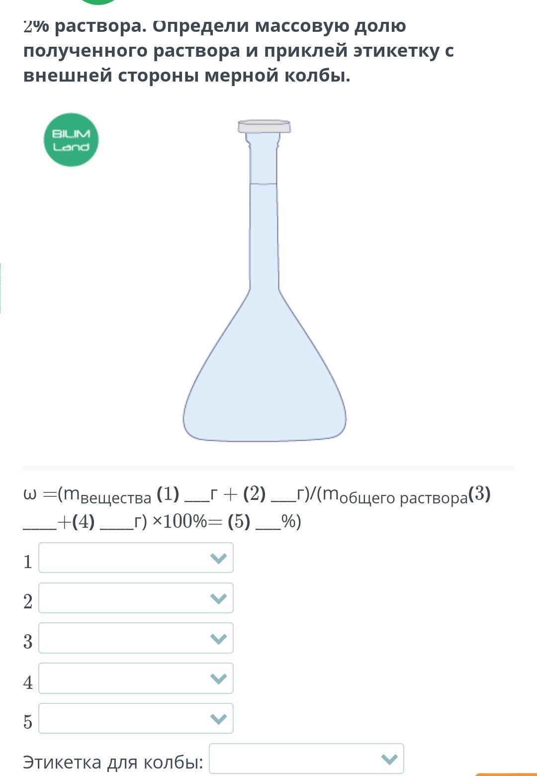 В лаборатории 100 г 3% раствора смешали с 100 г 2% раствора. Определи массовую долю полученного раствора и приклей этикетку с внешней стороны мерной колбы.