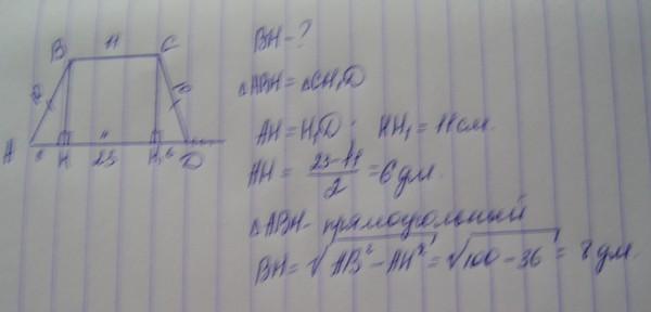 Основания равнобедренной трапеции равны 11 дм и 23 дм, боковая сторона -10дм. Найдите высоту трапеции.
