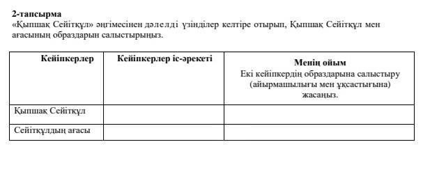 Ответ:Кыпышак Сейткул елине жаксы би болды. Сейткулдын агасы баска елди аралап сонында коз жумады. Сейткул оте акылды, талапты адам. Сейткулдын агасы алды артын ойламайтын, санасы Жак адам.