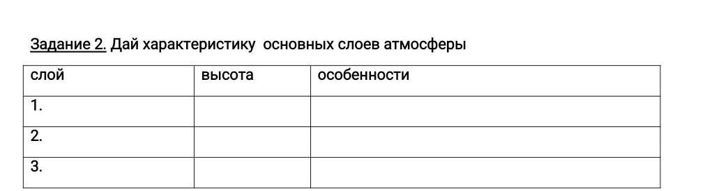 1. Тропосфера. - до 20км. - Наличие изменения погодных условий. 80% всей массы воздуха. Наличие перистых, кучевых и слоистых облаков.