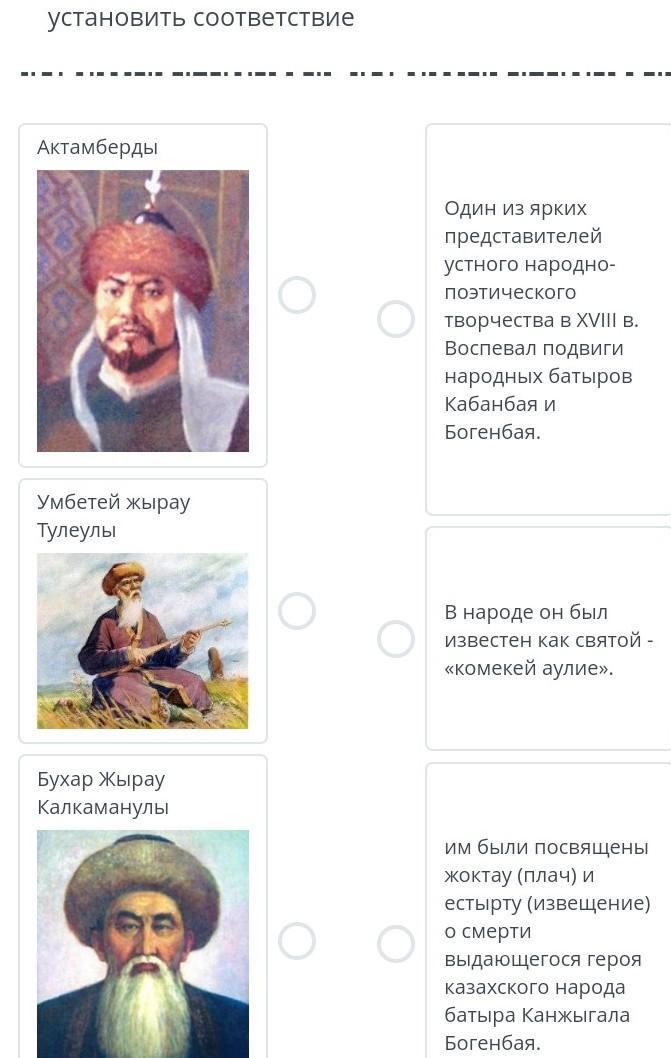 установить соответствие Актамберды Один представителей из ярких устного народно поэтического творчества в XVIII в. Воспевал подвиги народных батыров Кабанбая и Богенбая. он был известен как святой - «комекей аулие». В народе им были посвящены жоктау (плач) и естырту (извещение) о смерти Умбетей жырау Тулеулы Бухар Жырау Калкаманулы C