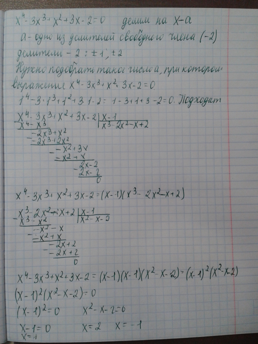 x^4-3x^3+x^2+3x-2=0 Помогите пожалуйста решить, я болела пропустилатеперь не знаю как. Помогите в долгу не останусь