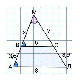 Основания трапеции равны 5 см и 8 см. Боковые стороны, равные 3,6 см и 3,9 см, продолжены до пересечения в точке M. Найдите расстояния от точки M до концов меньшего основания.