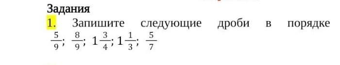 1. Запишите следующие дроби в порядке возрастания: 5/9,8/9,1 3/4,1 1/3,5/7