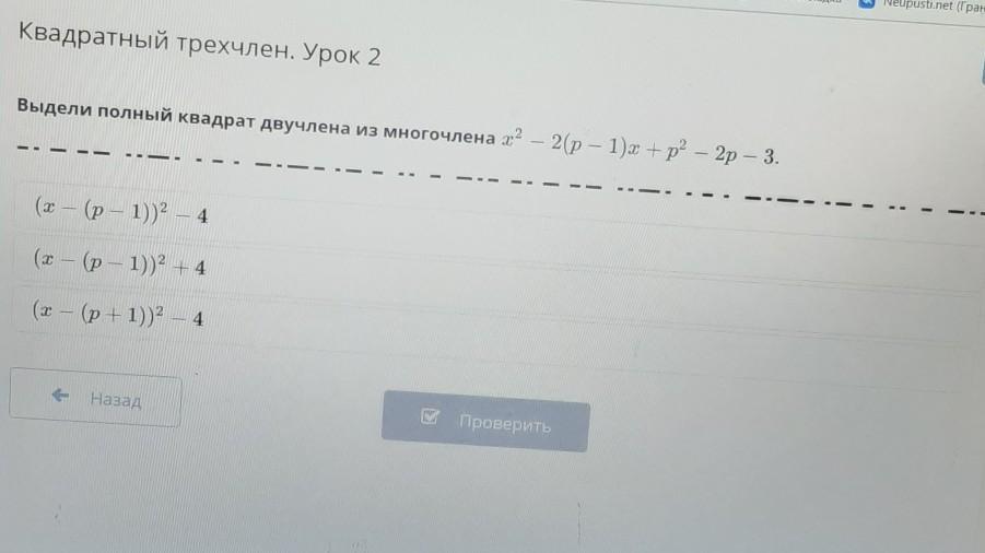 Выдели полный квадрат двучлена из многочлена т° — 20р — 1) +р? — 2р — 3.