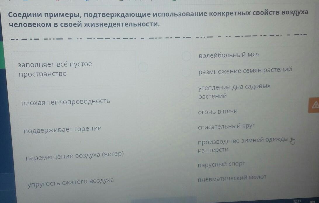 Соедини примеры, подтверждающие использование конкретных свойств воздуха