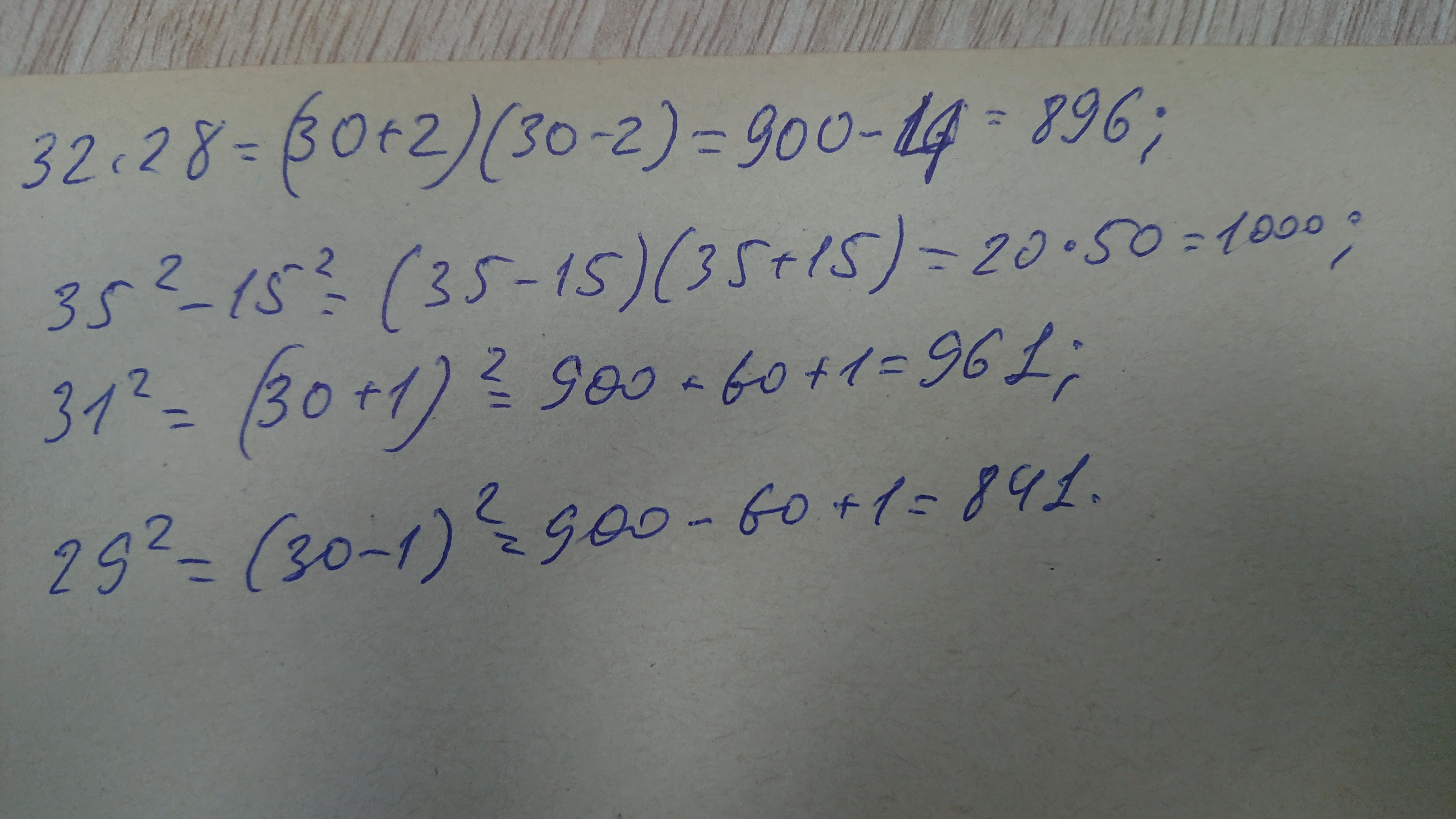 32*28=(30+2)*(30-2)=30²-2²=900-4=896.