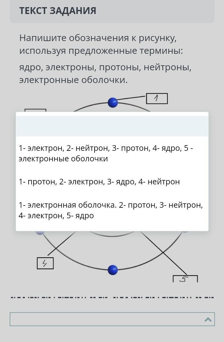 Ответ: 1-электрон 2-нейтрон 3-протон 4-ядро 5-электроные оболочки
