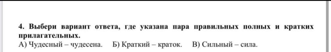 Выбери вариант ответа, где указано пара правильных Полных и кратких прилагательных. 1) Чудесный- чудесна . Б) Краткий - краток. В) Сильный- сила. Дам 12 баллов