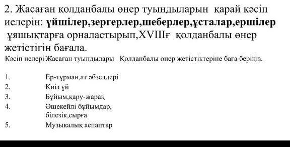 Ответ:Кәсіп иелері:1)жылқышы;2)ісмер;3)ерші;4)зергер;5)шебер;