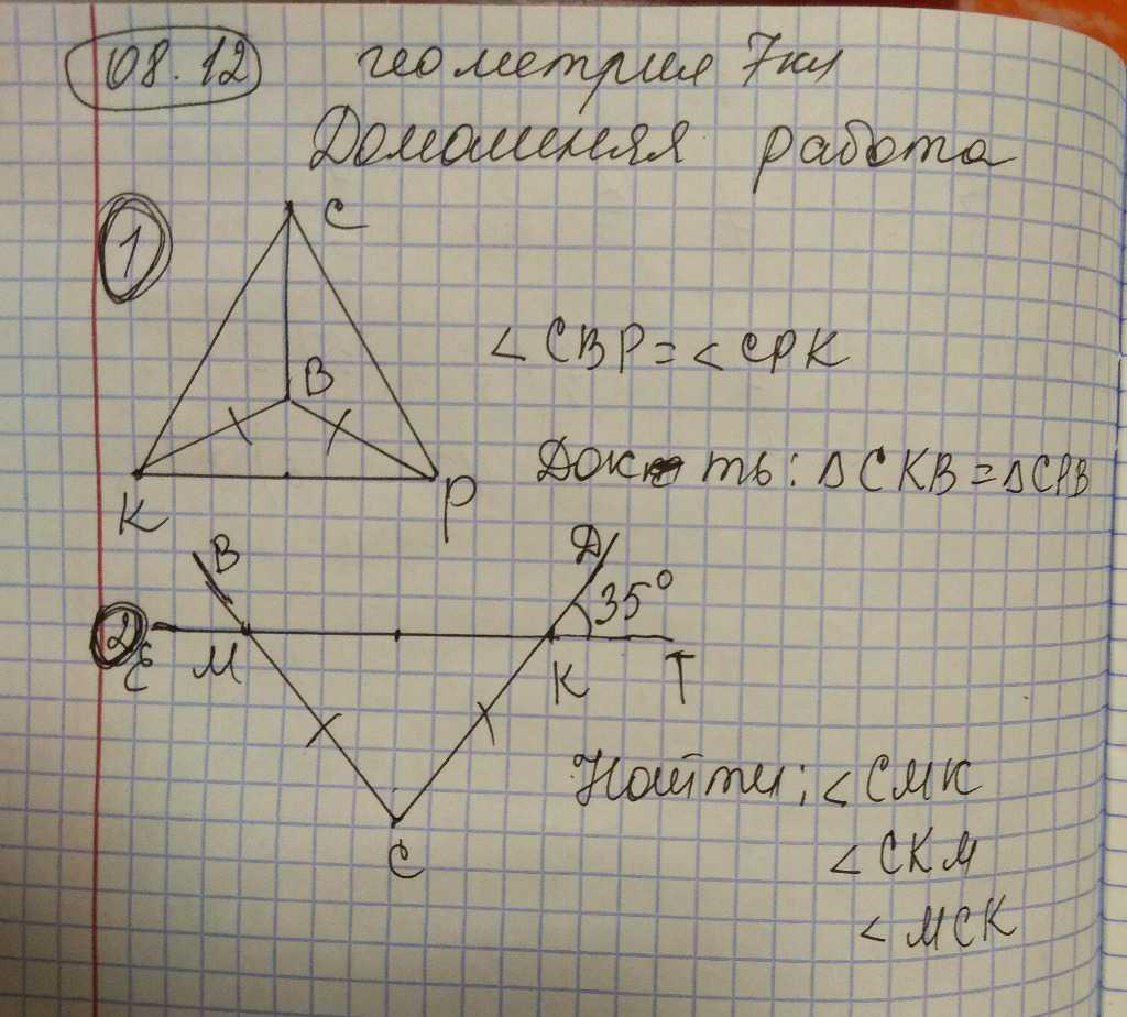 2) Угол DKT = MKC = 35 как вертикальные углы, так как треугольник MCK - равнобедренный по условию(MC = CK), то по его свойствам углы при основании равны (MK - основание) и угол CKM = CMK = 35 градусов.