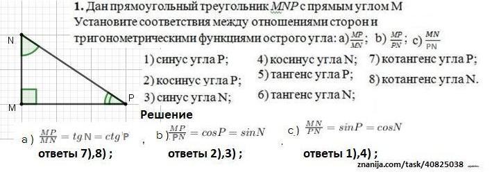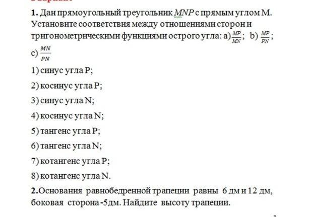 1. Дан прямоугольный треугольник MNP с прямым углом М. Установите соответствия между отношениями сторон и тригонометрическими функциями острого угла: а) ...б)...в)....