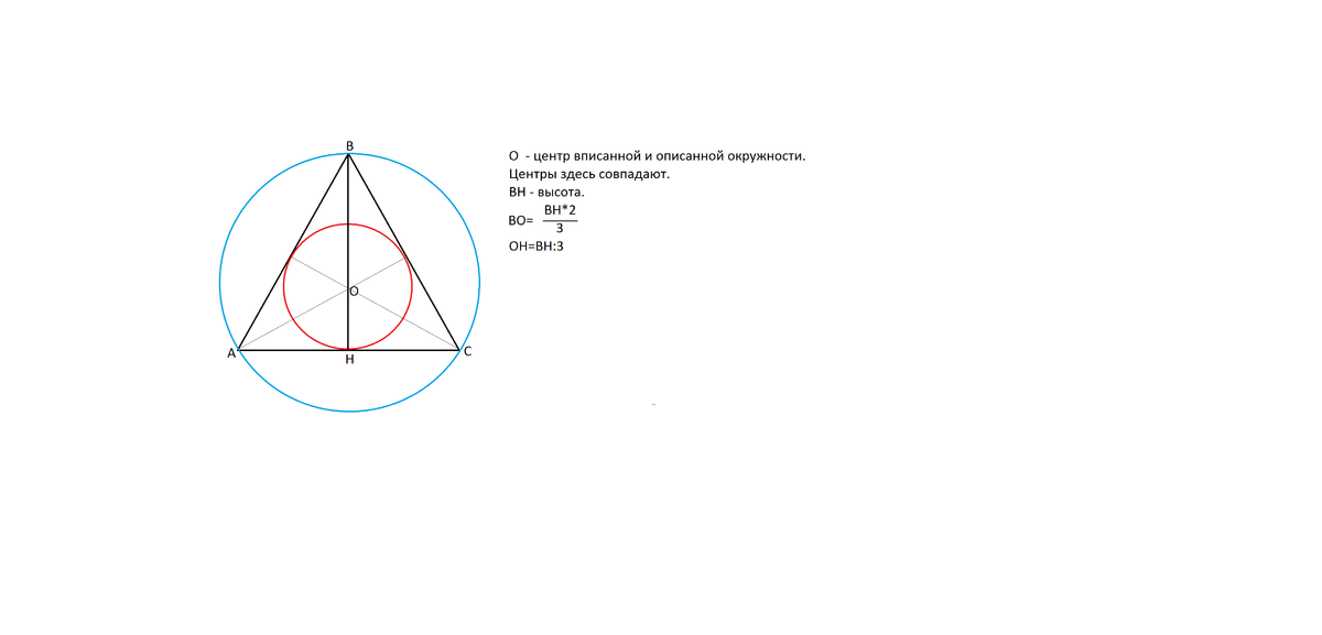 а вписанной - расстоянию от точки пересечения биссектрис до сторон треугольника и равен 1/3 высоты правильного треугольника.