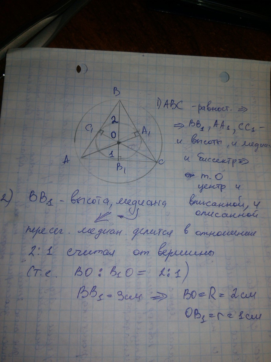 высота равностороннего треугольника 3см. Найдите радиус описанной около него окружности и радиус вписанной в него окружности.