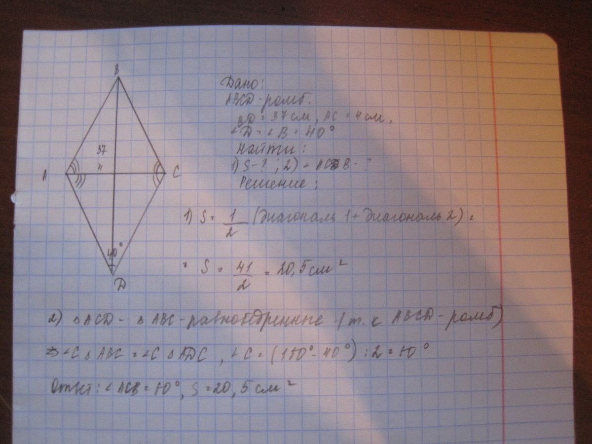 в ромбе ABCD угол CDA=40 градусов найдите угол АСВ?2.Найдите площадь ромба если его диагонали равны 37 и 4