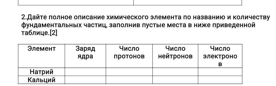 2.Дайте полное описание химического элемента по названию и количеству фундаментальных частиц, заполнив пустые места в ниже приведенной таблице.[2]