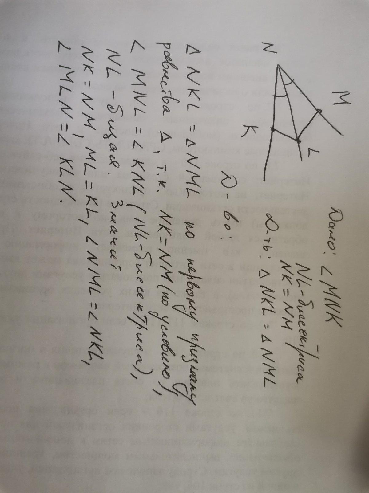 Луч NL – биссектриса угла MNK. На сторонах угла отложены равные отрезки NK и NM. Запишите равные элементы треугольников NKL и NML и определите, по какому признаку треугольники равны.