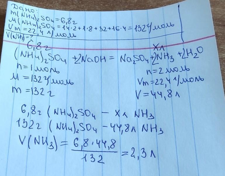 6.8 сульфат аммония смешали с гидроксидом натрия. Найти объем образовавшегося газа.